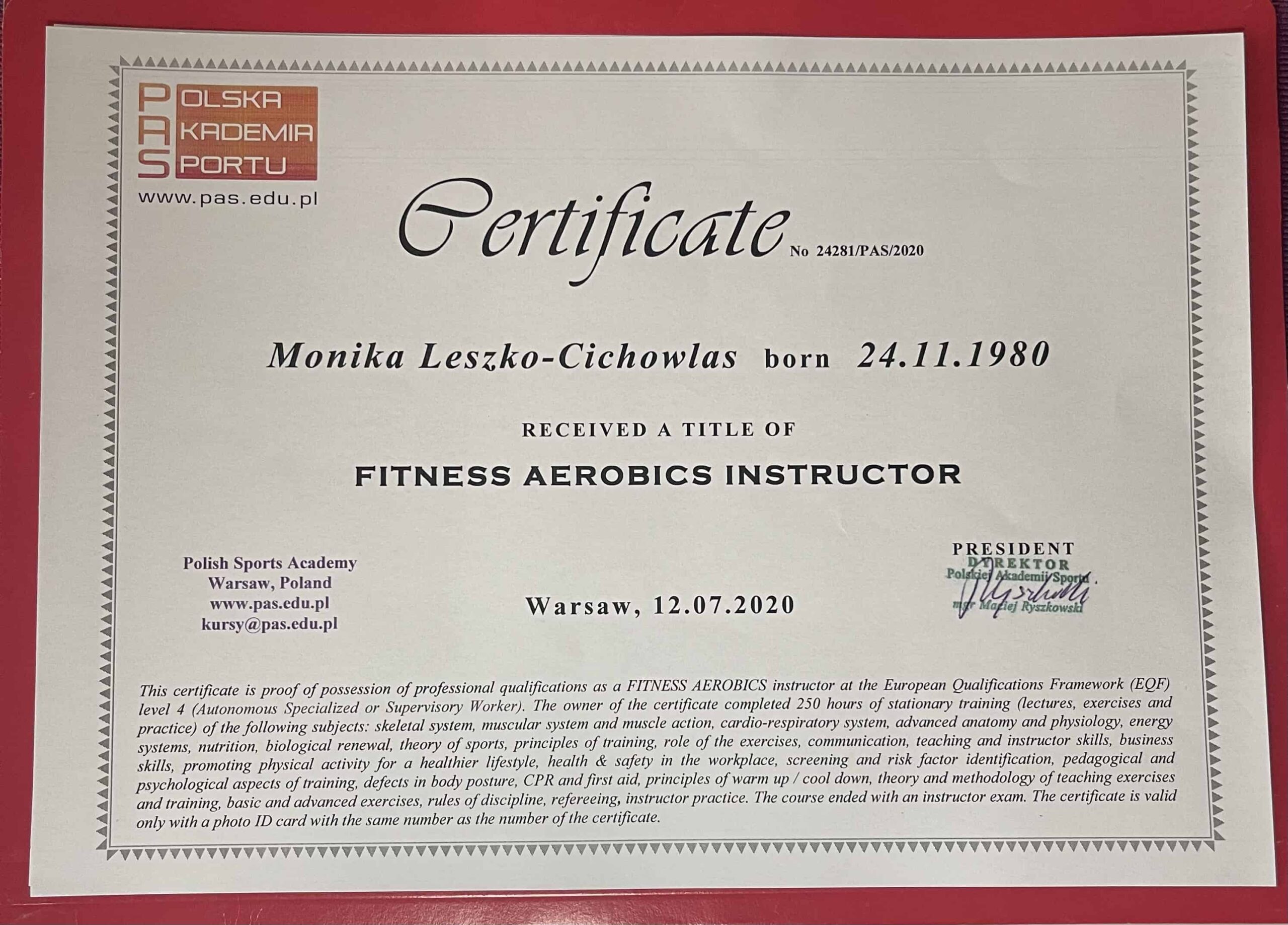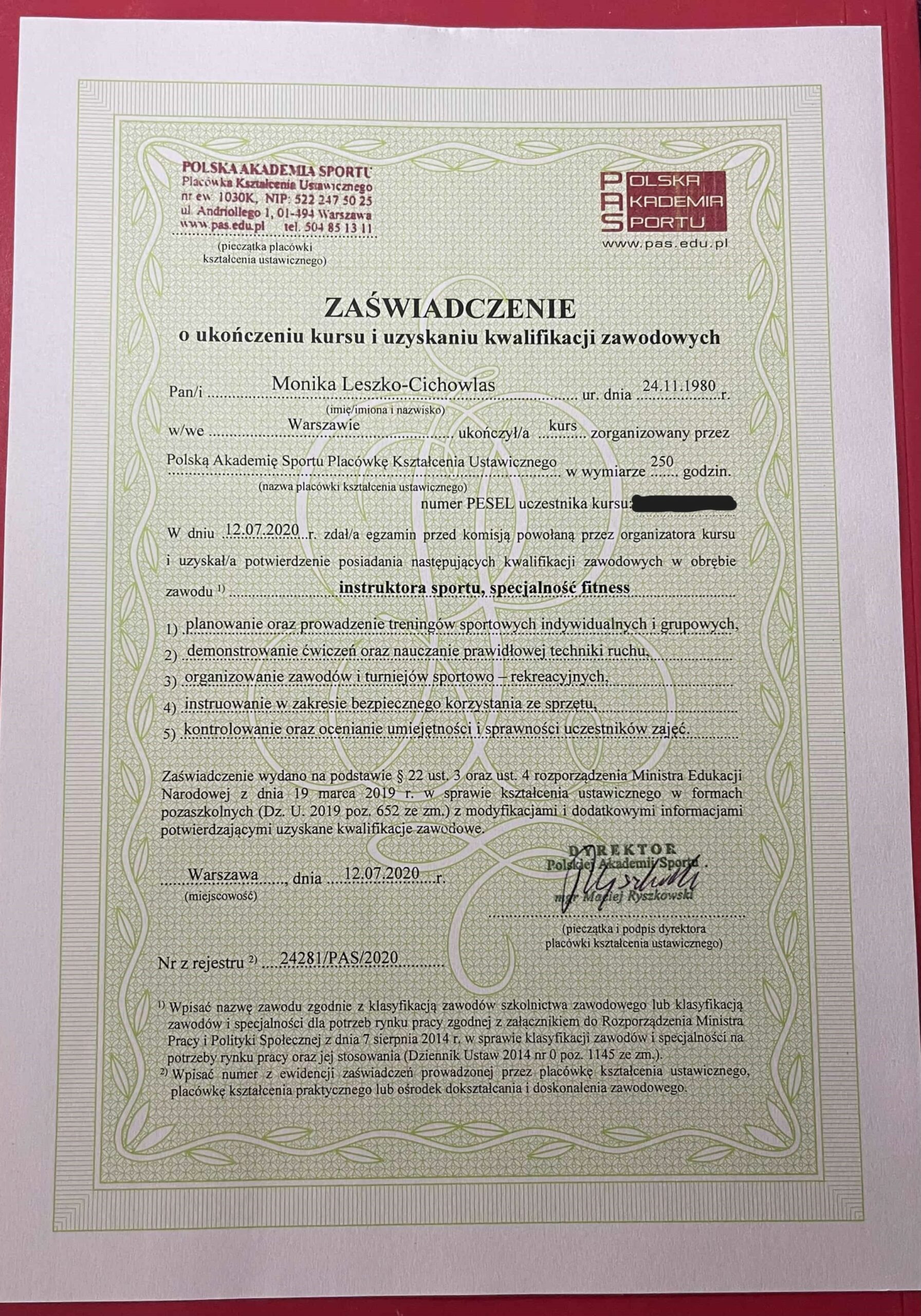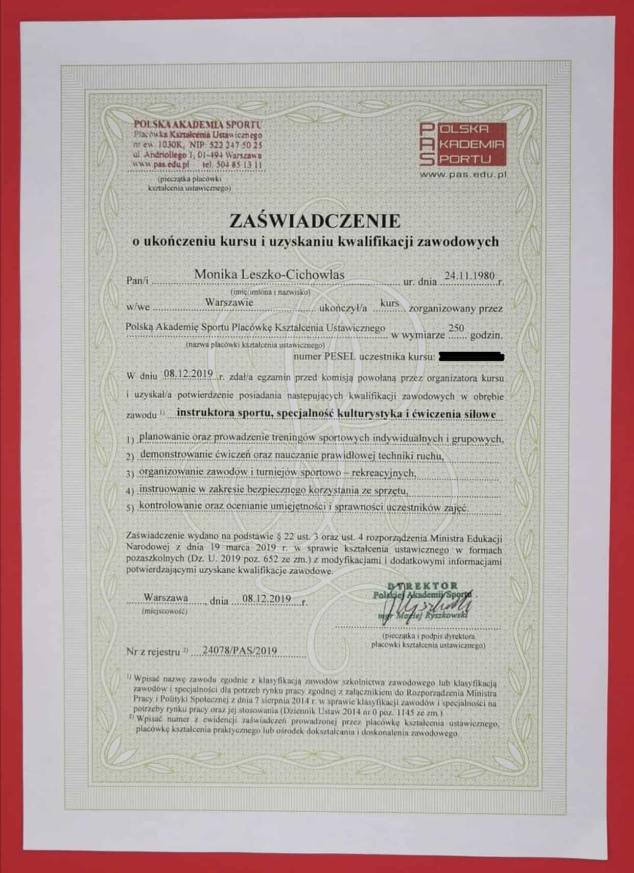 Poniżej znajdziesz część z dokumentów świadczących o mojej wiedzy i umiejętnościach w tym certyfikaty, dyplomy, zaświadczenia. Odpowiednia wiedza uzyskana w profesjonalnych placówkach w połączeniu z doświadczeniem spowodowała, że możesz mieć pewność bycia w dobrych rękach. Masz do czynienia z osobą, która jest przygotowana do poprowadzenia Ciebie we właściwy sposób tj. efektywnie i bezpiecznie. Szczycę się rozległą wiedzą nie tylko treningową, ale i na temat anatomii, fizjologii, dietetyki oraz szeroko rozumianej psychiki człowieka, jego motywacji, pracy nad pewnością siebie i poczuciem własnej wartości. To wszystko sprawia, że poczujesz się właściwie zaopiekowana!